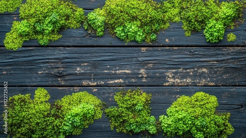 Lush green moss on weathered wooden planks, creating a natural and serene atmosphere.