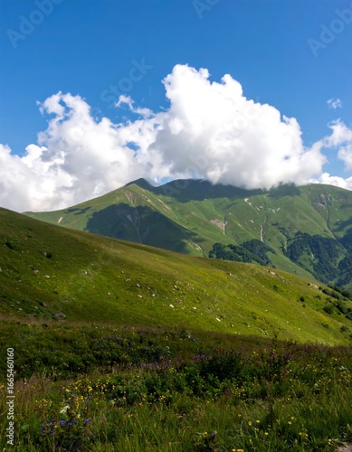 mountain, meadow, green, sky, blue, cloud, peak, vale, hill, grass, flora, nature, landscape, vegetation, scenic, summer, hiking, travel, vista, elevation, summit, rolling, hill, cloud, light, bright, beauty, wild, flower
