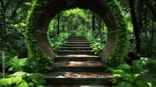 Lush, green pathway through a circular archway in a tropical garden. Lush vegetation surrounds stone steps leading into a hidden forest