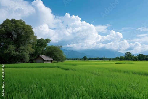Lush green rice field with cottage and tree under vibrant blue sky and clouds