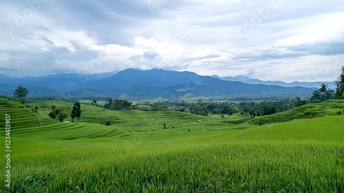 Lush green rice terraces, mountain backdrop, rural Vietnam, idyllic landscape, perfect for travel brochures