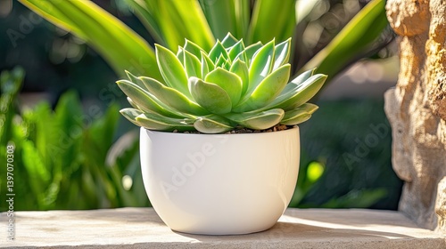 Lush Green Succulent Plant in White Pot on Natural Stone Surface