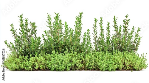 thyme, herb, plant, green, leaf, bush, sprig, foliage, vegetation, nature, botanical, garden, cooking, food, ingredient, aroma, fragrance, favor, culinary, seasoning, spice, healthy, fresh, organic, natural, growth, texture, background, isolated, white, row, clump, flocked, border, hedge, shrub, aromatic, wellness, cookery, mediterranean, rustic, wild, summer, spring, crop, harvest