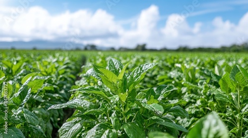 tobacco, plant, field, agriculture, farming, leaf, green, growth, nature, rural, landscape, sunny, sky, cloud, day, bright, summer, spring, harvest, crop, plantation, row, cultivation, dirtied, vegetation, botany, ecology, environment, farm, land, produce, natural, fresh, healthy, vibrant, abundant, lush, scenic, view, background, image, photo, picture