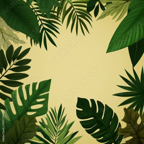 leaf, green, tropical, plant, foliage, nature, background, frame, border, design, illustration, summer, jungle, rainforest, palm, exotic, vibrant, lush, organic, pattern, texture, element, decoration, flora, botany, greenery, growth, colours, bright, fresh, beauty, natural, scene, image, graphic, template, wallpaper, abstract, style, artwork, digital, art