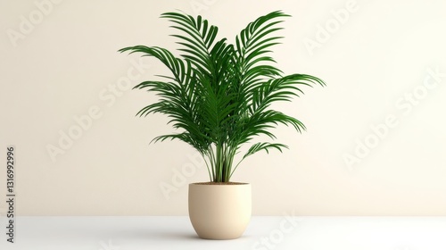 Lush Green Tropical Plant in Minimalist Cream Pot with Neutral Background