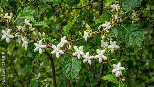 Lush jasmine vine with white flowers elegant green leaves in a tranquil garden setting