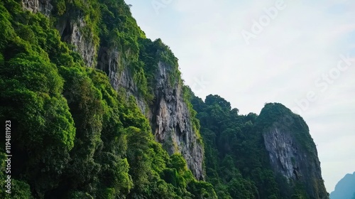 karst, landscape, mountain, cliff, rock, vegetation, green, jungle, tropical, nature, scenic, view, outdoors, travel, photo, summer, sky, tree, hill, geology, formation, environment, ecosystem, flora, fauna, wildlife, habitat, earth, planet, earth, geography, exploration, adventure, discovery, scenic view, mountain chain, rock formation, travel destination, summer getaway, natural beauty, environmental conservation