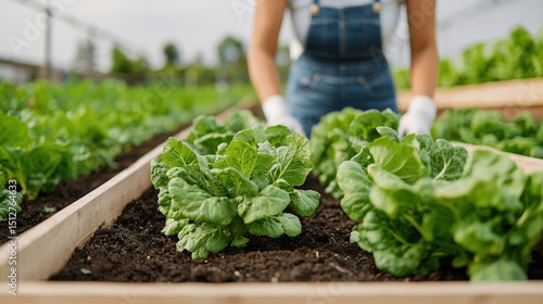 Lush lettuce thrives in raised garden bed, nurtured by farmer fostering local, eco-conscious food production