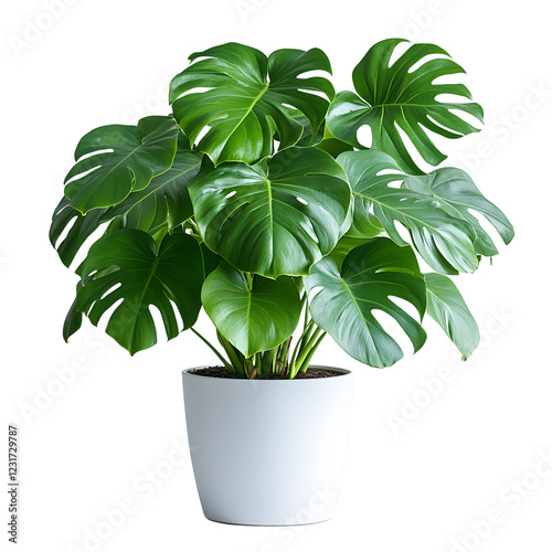 Lush monstera deliciosa plant in white pot isolated on transparent background