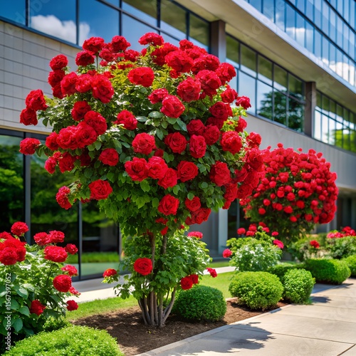 rose, red, bush, garden, blooming, flower, floral, nature, plant, green, leaf, summer, spring, beauty, fragrance, scent, romance, love, decoration, landscaping, exterior, building, architecture, modern, glasses, facades, window, sky, cloud, pathway, sidewalk, suppressing, sunlight, daytime