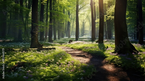 lush, spring, wood, illustration, forest, sunlight, tree, green, wildflower, serene, nature, beauty, tranquil, vibrant, foliage, canopy, blossom, peaceful, meadow, flora, fauna, landscape, picturesque, verdant, growth, renewal, harmony, ecosystem, wilderness, rejuvenation