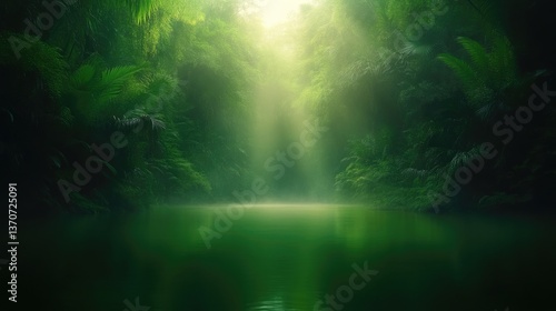 Lush, sunlit rainforest river. Misty, verdant path through dense jungle foliage