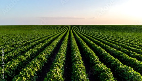 Lush, symmetrical green crop rows stretching to horizon under a clear sky, vibrant and fresh, suggesting fertile land