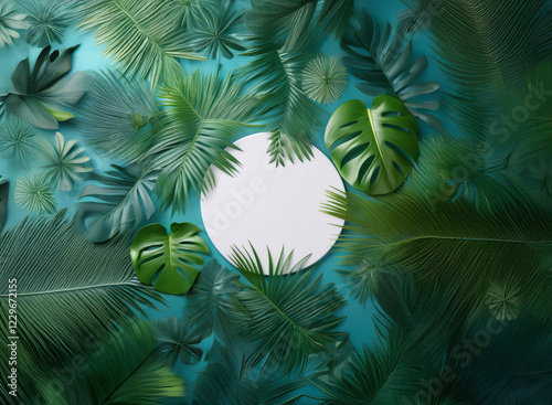 Lush tropical leaves surround a blank circular space on a teal background. Perfect for product display or summer designs.