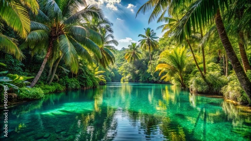 Lush tropical oasis with vibrant tresses, emerald foliage, and shimmering masks