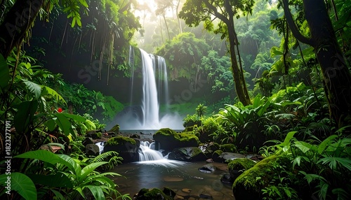 waterfall, jungle, rainforest, nature, landscape, water, green, tree, sunlight, scenic, tropical, forest, beauty, stream, tranquil, vibrant, leaf, rock, moss, cascade, flowing, panorama, untouched, serene, picturesque, ecosystem, environment, pristine, vegetation, wild, natural, freshness, growth, exotic, adventure, exploration, paradise, perspective, clarity, light, dappled