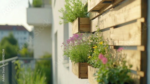 Lush vertical garden featuring assorted flowers and herbs in wooden boxes, set against a sunny balcony backdrop with urban scenery
