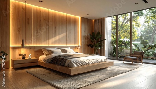 bedchamber, interior, design, luxury, modern, wooden, decor, cosy, relaxation, calmness, comfortable, elegance, stylish, contemporary, ambience, minimalist, natural, light, window, view, nature, garden, plant, chair, rug, floor, furniture, bedding, pillow, wall, panel, pendant, table, home, residence, apartment, dwelling, indoor, space, wood, paneling, peaceful, calm