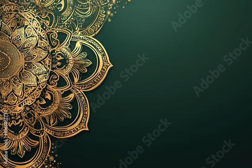 Luxurious background with a dark green color and a golden mandala ornament, with empty space on the right side for text or design. Vector illustration style, in a flat style, high resolution