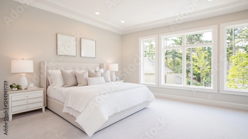 Luxurious bedroom with large windows, showing tranquil backyard view; ideal for real estate listings