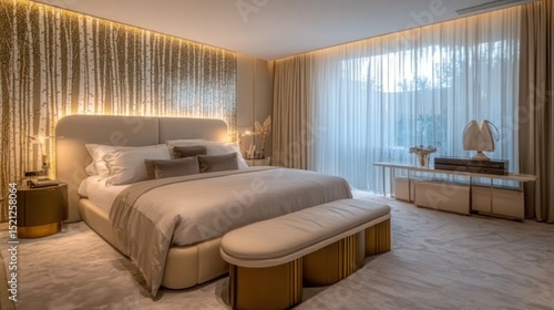 gold, cabinet, roomy, sofa, decor, calm, stylish, contemporary, table, wall, curtain, tone, neutral, carpet, window, cosy, beige, furniture, elegant, room, sophisticated, light, modern, house, home, interior, apartment, design, bedding, lighting, bedchamber, comfortable, bed, pillow, luxury