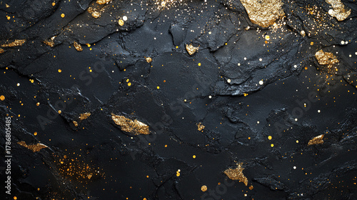 Luxurious black textured surface with scattered gold flakes and shiny metallic spots creating elegant and rich abstract background with sophisticated and glamorous feel