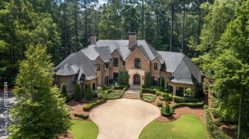 house, home, luxury home, luxury, brick, stone, roof, tree, wood, forest, landscaping, garden, yard, driveway, pathway, entranceway, door, window, architecture, style, elegant, grand, roomy, large, estate, property, real, residential, suburban, affluent, nature, green, foliage, shrub, bush, plant, design, exterior, facades, view, aerial, photo
