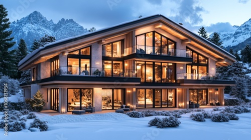 chalet, luxury, home, house, architecture, modern, winter, snow, mountain, landscape, real estate, property, exterior, night, lighting, cosy, warm, design, alpine, scenic, view, holiday, vacation, residential, building, beautiful, tranquil, serene, comfortable, elegant