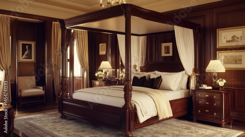 bedchamber, interior, design, luxury, wood, dark, room, decor, furniture, canopy, bed, textile, white, light, classic, elegant, cosy, comfortable, ornate, style, home, ambience, sophistication, detail, wooden, frame, picture, lighting, accessory, rug, drape, cushion, pillow, gentle, soft, calm, refined, modern, rich, warm, upholstery, patterned