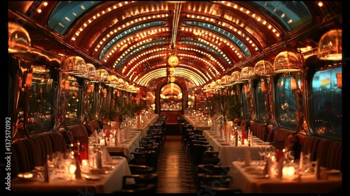 eatery, train, dining, vintage, luxury, interior, elegant, romantic, posh, table, candlelight, light, gold, brown, wood, brass, metal, copper, warm, atmosphere, cosy, gloomy, dark, night, evening, dinner, food, travel, retro, classic, railway, carriage, seat, chair, window, lamp, decor, design, stylish, old