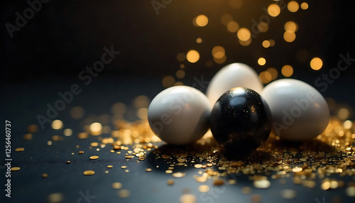 Luxurious Easter Banner, Black & White Eggs with Golden Accents in Spotlight, Festive eggs with copy-space, Easter post card with eggs, created with generative ai