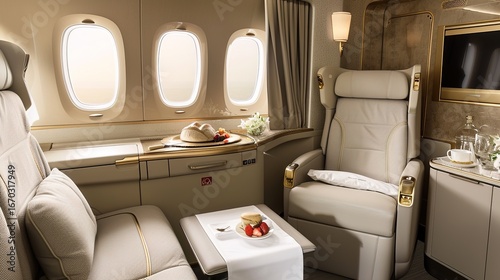 Luxurious First Class Travel Experience Backgrounds: Elegant Designs Showcasing Spacious Seats, Premium Amenity Kits, Fine Dining Platters, and Soft Ambient Lighting, Blended with Neutral Tones and So