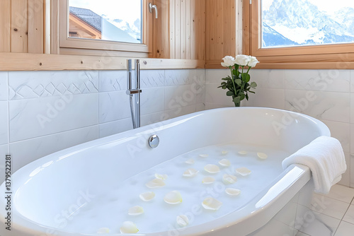 bathtub, bathroom, luxury, spa, relaxation, flower petals, flower, white, wooden, mountain, view, window, serene, calm, peaceful, tranquil, clean, modern, elegant, sophisticated, romantic, cosy, comfort, wellness, health, hygiene, water, bubble, towel, interior, design, home, hotel, resort, travel, vacation, escape, retreat, fresh, bright, aesthetic, beauty, minimalist, stylish, cleanliness