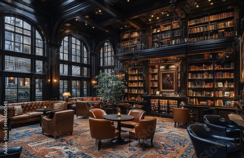 library, lounge, luxury, city, view, reading, relaxation, book, interior, design, elegant, comfortable, hotel, cosy, quiet, sophisticated, vintage, classic, rich, dark, wood, window, chair, table, carpet, atmosphere, space, room, study, learn, cognition, work, meeting, conversation, secluded, peaceful, serene, reflective, intellectual, prestigious, exclusive, private, grand, majestic, brilliancy
