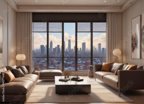 Luxurious living room, stylish blinds, city view, stylish, aesthetic
