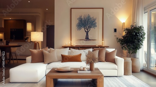 luxurious living room, warm lighting, elegant sofa, golden accents, modern art, potted plant, coffee table, textured wall panels, decorative pillows, cozy atmosphere, minimalist design, earth tones, a