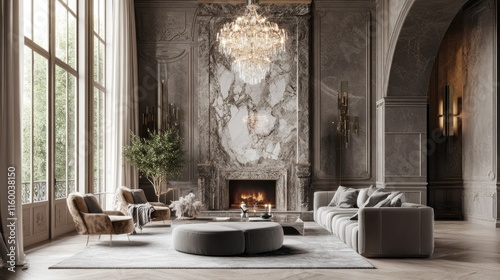 Luxurious Living Room with Marble Fireplace and Chandelier