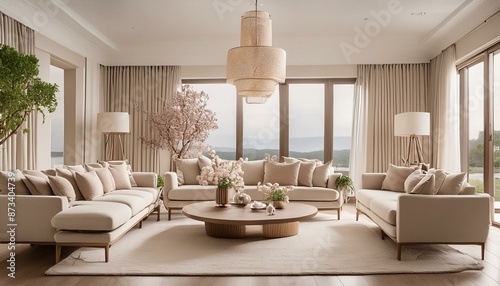 Luxurious living room with modern furniture, neutral tones, and elegant decoration