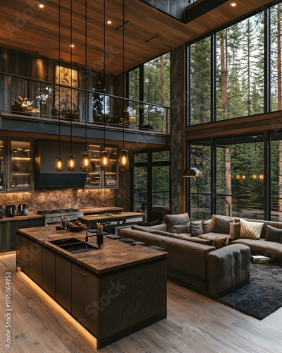 Luxurious modern kitchen and living area design in a stunning mountain lodge with floor-to-ceiling windows showcasing breathtaking forest views.