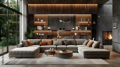 living room, modern style, luxury, comfortable, sofa, coffee table, carpet, fireplace, bookshelf, green plant, open space, interior design, villa, luxury home, house, apartment, real estate, architecture, property, home, life, taste, style, grade, fashionable, trendy, avant-garde, technology, automation, control system, security, monitoring, audio, television, projector, screen, leisure, relaxation