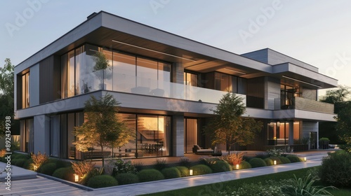 Luxurious modern suburban home with a sleek design, featuring large windows and a minimalist landscaping