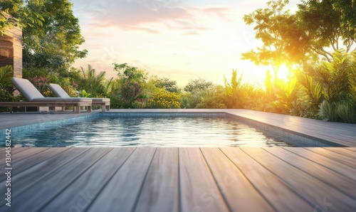 Luxurious poolside area with sleek wooden decking, modern furniture, and vibrant greenery under golden evening sunlight