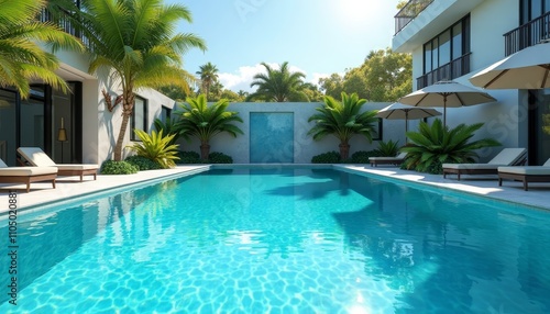 Luxurious poolside patio with blue water, palm trees, lounge chairs, and umbrellas, set against a