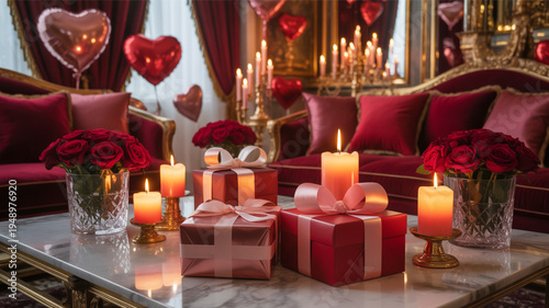 Luxurious romantic living room interior with candles gifts roses and heart balloons for valentine's day
