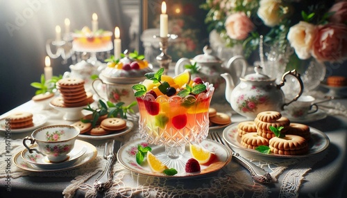 Luxurious setup of a tea party featuring fine porcelain, vibrant fruits, tea pots, and delicious pastries, arranged with ornate details and surrounded by floral decorations exuding charm and sophistic