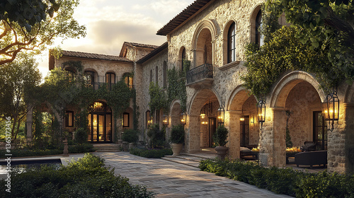 estate, tuscany, luxurious, sandstone, wall, greenery, arch, courtyard, villa, architecture, mediterranean, elegant, rustic, stone, facades, garden, patio, evening, light, window, balcony, tree, plant, pathway, entrance, classic, serene, landscape, luxury home