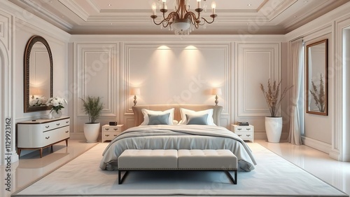 Luxurious white master bedroom with elegant furniture, soft bedding, and minimalistic decor, master bedroom, luxury interior