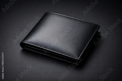 Luxury black leather men wallet lying on a dark moody surface with soft lighting for high end fashion branding and product advertisement mockup