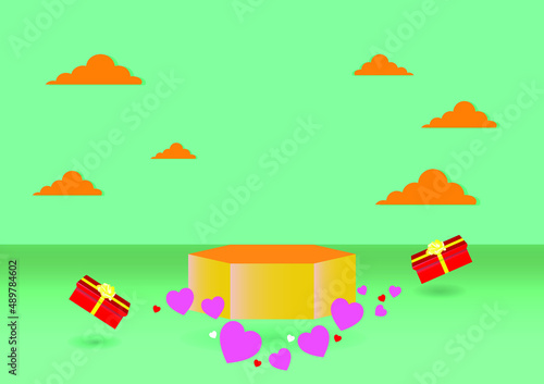 Luxury brown-gold square podium on light green empty room background. gift box and heart decorate. Abstract vector rendering 3d shape for the advertising products display. Minimal scene studio room.